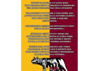 CURVA SUD Chiama a raccolta i tifosi PER Roma-Bologna: “Coloriamo l’Olimpico” (C.U.)