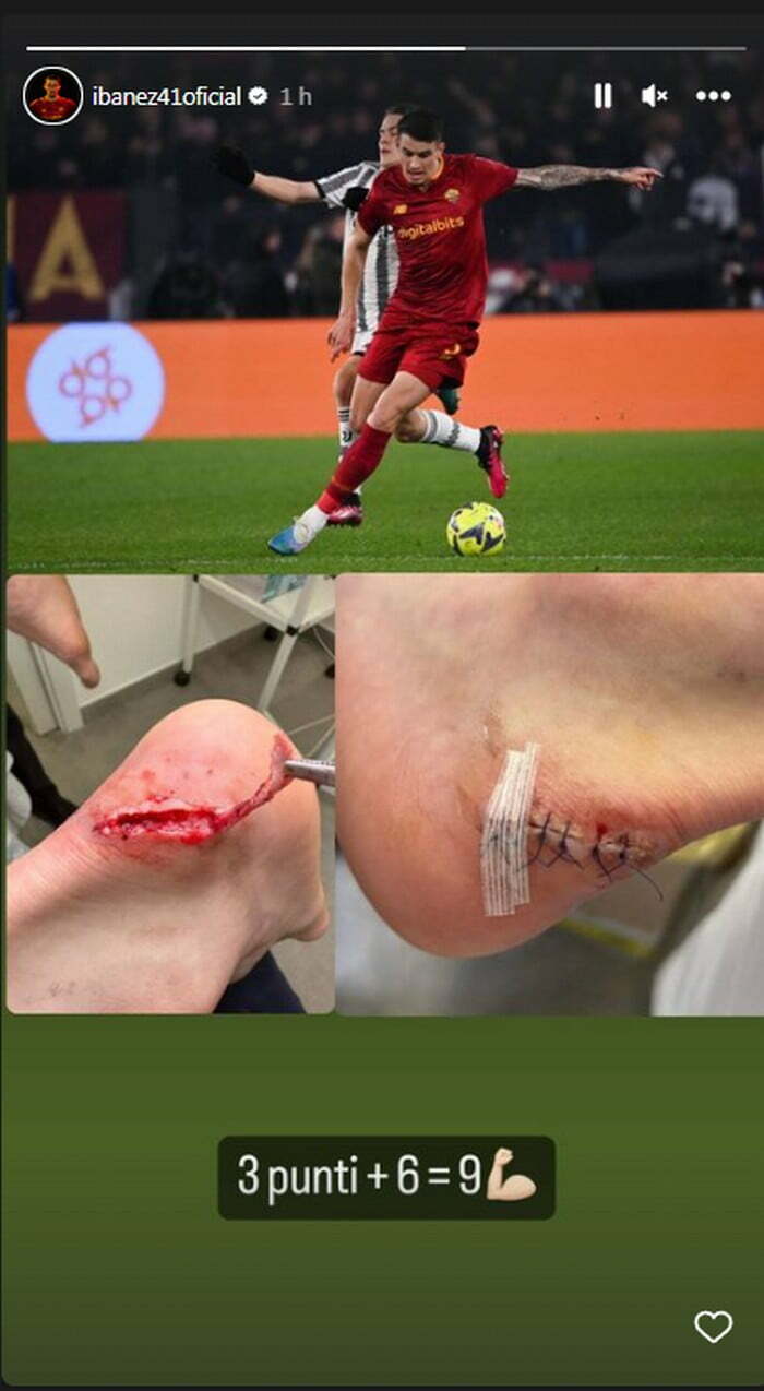 Il fifensore giallorosso, Roger Ibanez, ha svelato che dopo la partita contro la Juventus, ha avuto bisogno di un’intervento di sutura per chiudere un ferita dietro al tallone subita durante l’incontro contro la Juventus: gli sono stati applicati 5 punti di sutura e scherzosamente ha postato una frase, con la foto della ferita, che recitava: “3+6=9”.