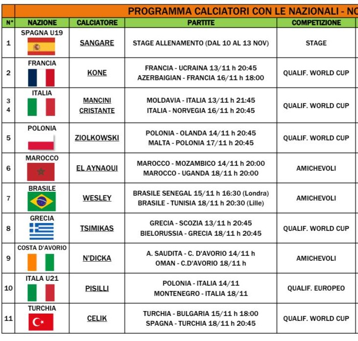 NOTA: Anche se Evan N’Dicka è nella lista, lo stesso non è partito ma potrebbe farlo, se la situazione migliora, per la seconda partita.
