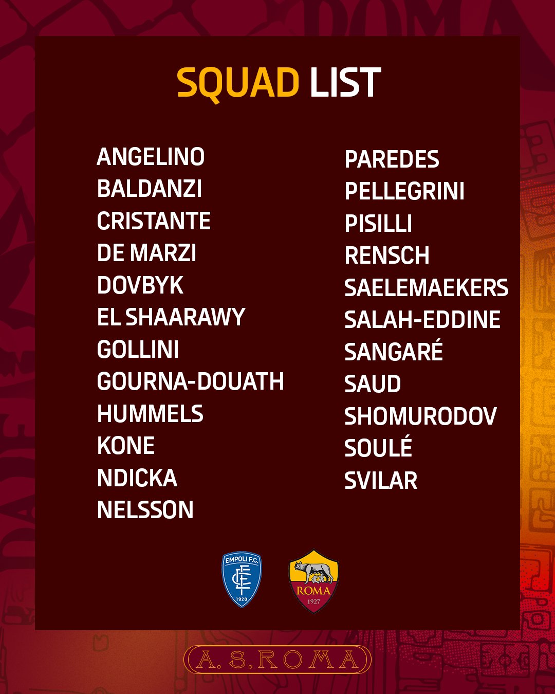 Angeliño, Baldanzi, Cristante, De Marzi, Dovbyk, El Shaarawy, Gollini, Gourna-Douath, Hummels, Koné, Mancini, Ndicka, Nelsson, Paredes, Pellegrini, Pisilli, Rensch, Saelemaekers, Salah-Eddine, Abdulhamid, Shomurodov, Soulé, Svilar.