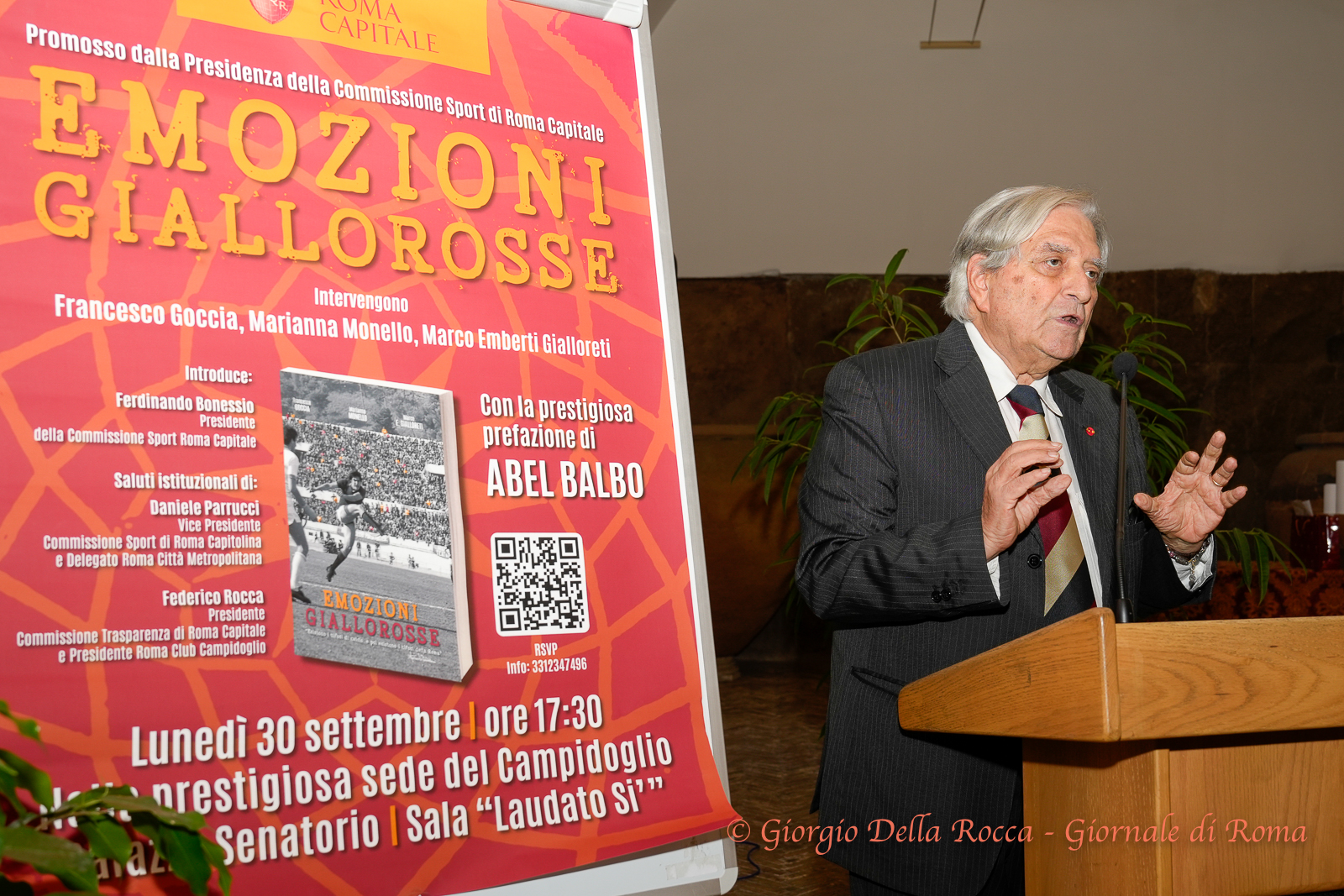 Si è svolta in Campidoglio presso la bellissima “Sala del Carroccio” la presentazione del libro Emozioni Giallorosse. Un libro scritto da Francesco Goccia, Marianna Monello e Marco Emberti Gialloreti con la prestigiosa prefazione del Campione d’Italia Abel Balbo. Proprio Abel Balbo, attraverso un video messaggio ha voluto portare il proprio saluto ai presenti: