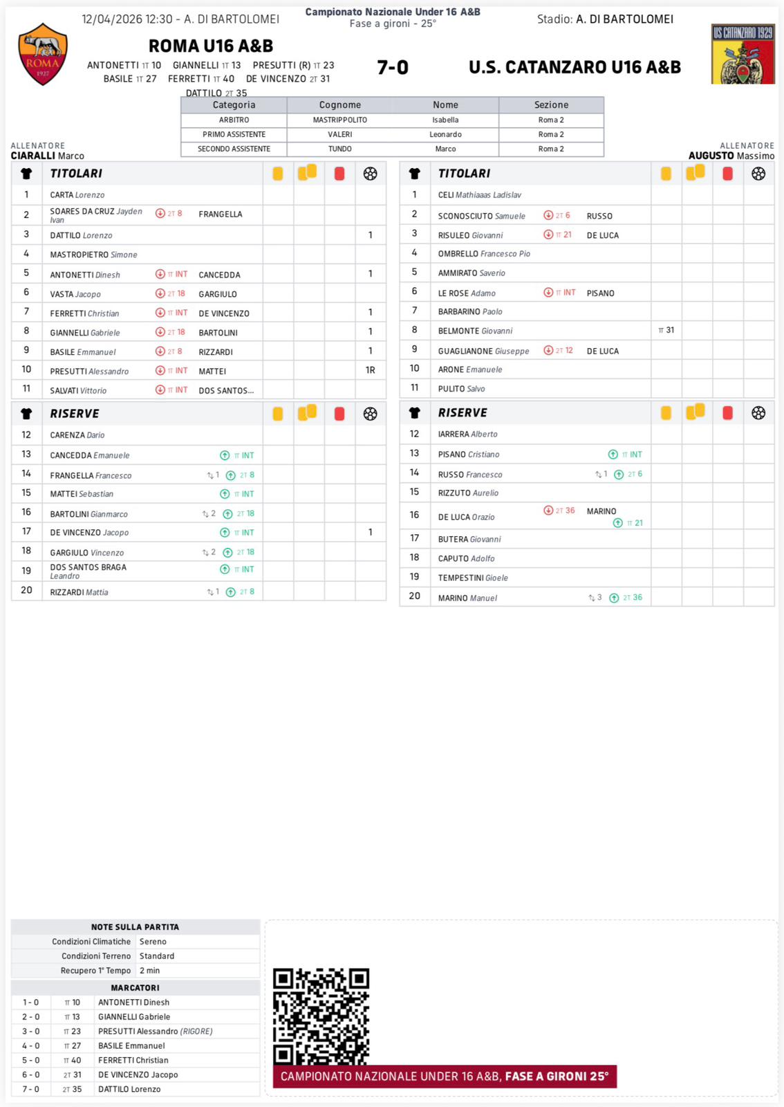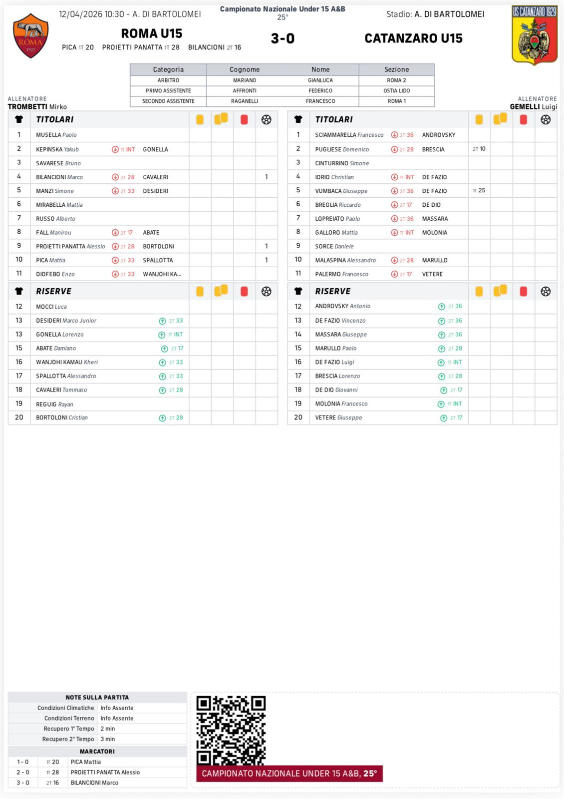 La Roma batte il Catanzaro per 3-0 e conquista aritmeticamente il primo posto nel girone, che le consentirà di avere – almeno sulla carta – un cammino più semplice nei playoff. Le reti di Pica, Proietti Panatta e Bilancioni portano dunque i tre punti decisivi per coronare una stagione più che positiva. La Lazio, infatti, che comunque vince sul campo del Lecce grazie a una rimonta nel finale targata Bacchi-Radu – resta a -4 con una gara da disputare, l’ultima della regular season. Tris esterno, invece, per il Frosinone che s’impone sul campo del Palermo grazie alla doppietta di Matteo Ioli ed al gol di Cretara.