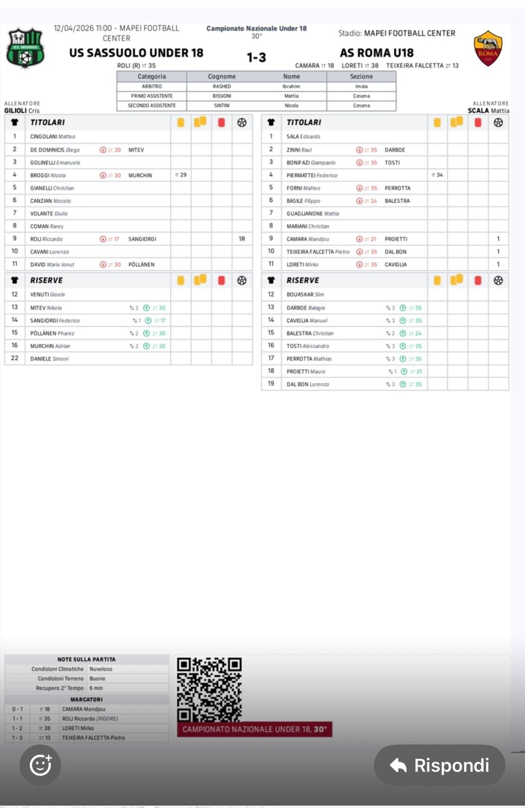 Una Roma ancora una volta perfetta in tutto e per tutto splende in casa del Sassuolo conquistando altri tre punti utili nella serrata lotta per il primo posto. Dopo il gol di Camara, i neroverdi pareggiano i conti su calcio di rigore, ma la truppa di Mattia Scala torna rapidamente in pieno controllo del match. Loreti firma il nuovo vantaggio, Falcetta l’allungo definitivo.