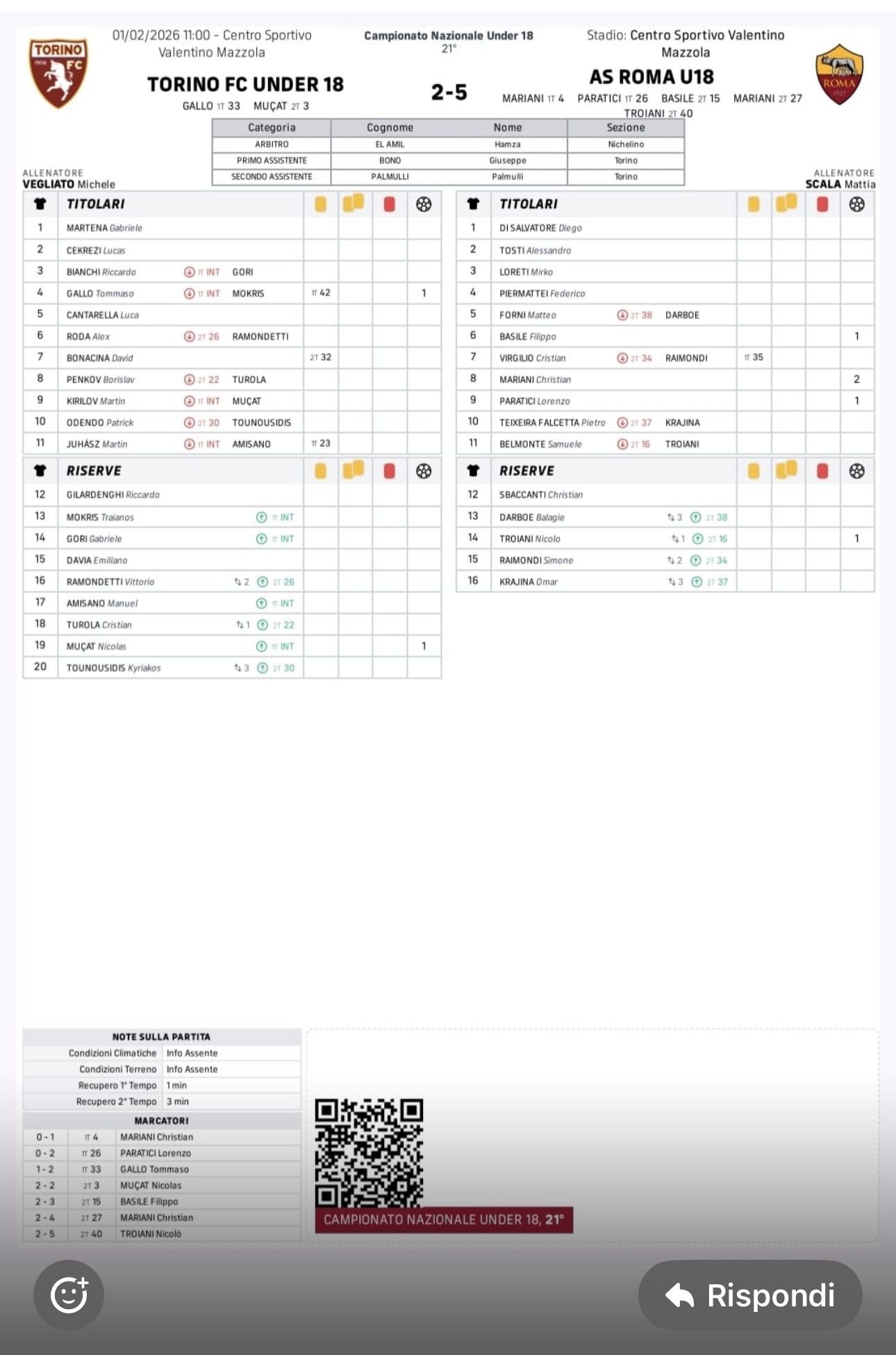 La Roma continua a macinare vittorie, nonostante le tante assenze con cui ha dovuto fare i conti Mattia Scala per la trasferta di Torino. In casa dei granata finisce addirittura 2-5 grazie alla doppietta di Mariani, oltre ai sigilli di Paratici, Troiani e Basile.