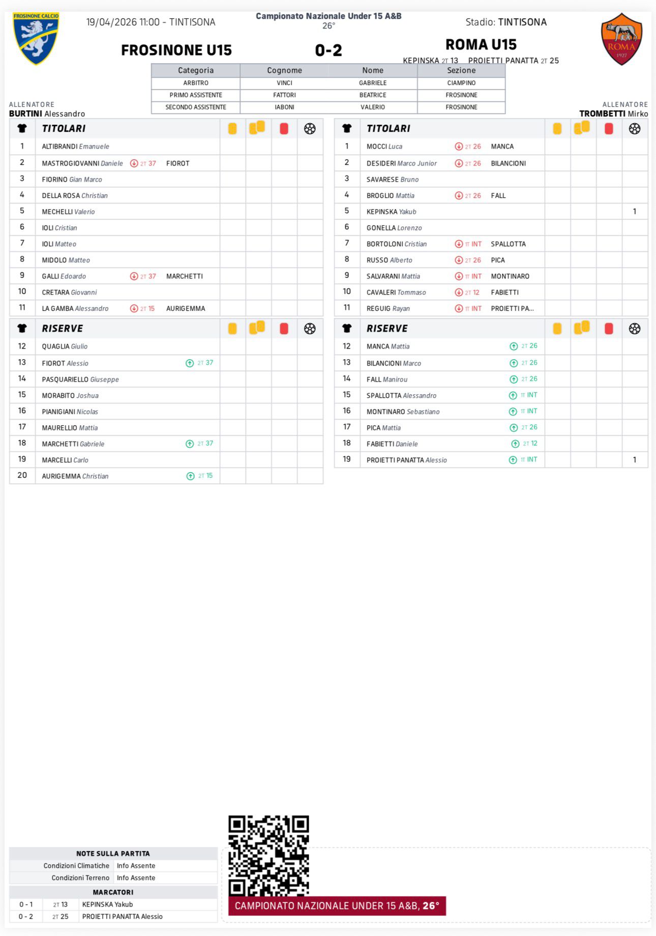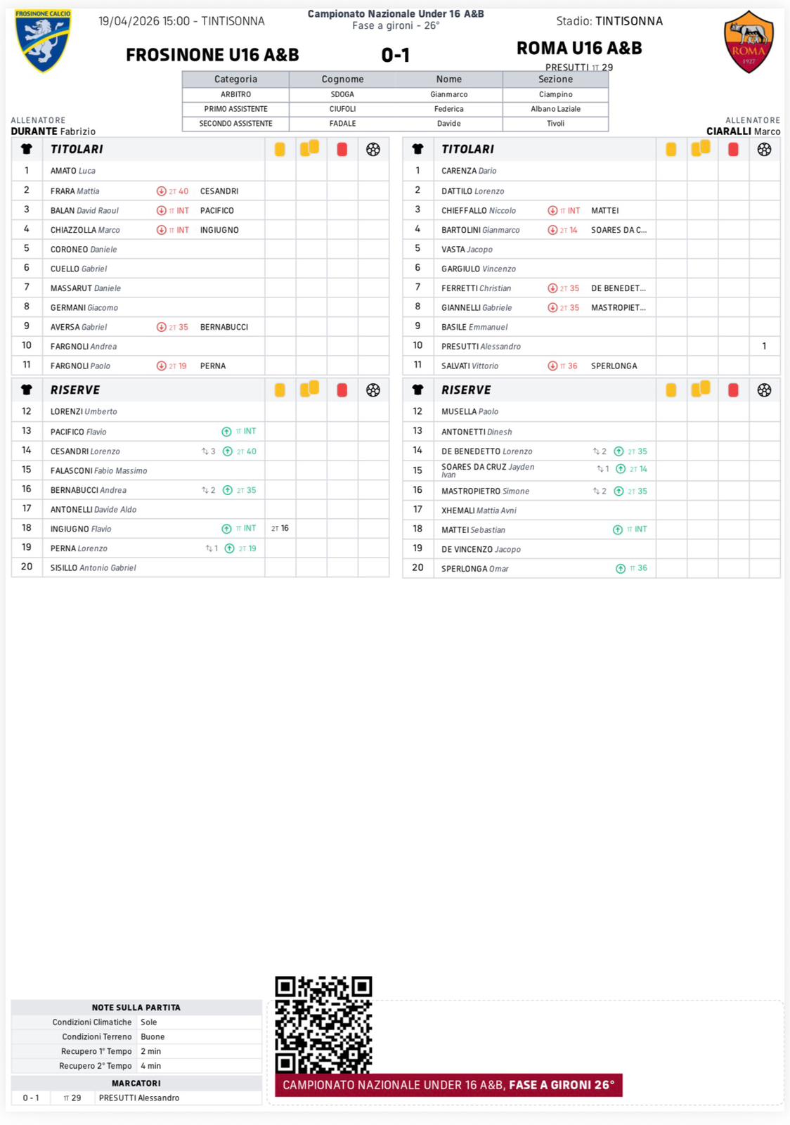 Chiusa la regular-season del campionato Under 16 Serie A e B, con la Roma corsara in quel di Paliano, sul Frosinone. Termina 0-1 il confronto con gol decisivo di Presutti, giallorossi che chiudono al primo posto a 61.