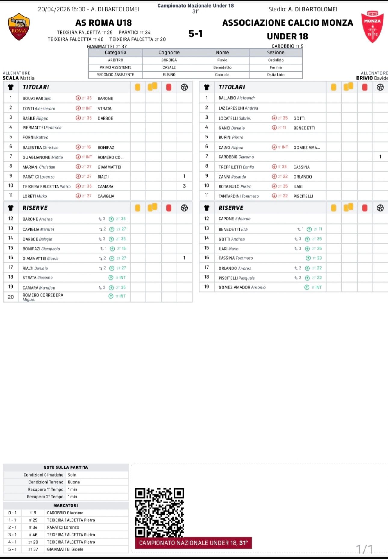 La gara Al 10’ prima vera occasione da goal della partita e vantaggio ospite. Angolo battuto bene per Carobbio, che svetta sopra più in alto di tutti e supera Bouaskar, non irresistibile in questo frangente. La truppa di Scala continua a fare gioco grazie ad una manovra ben fatta, mancando però lo specchio in un paio di frangenti. Con il passare dei minuti, cresce la Roma con Teixeira e Guaglianone molto ispirati, ma sono ancora in biancorossi a sfiorare il raddoppio. Bella palla in profondità per Zanni che punta e salta l’avversario, ma non riesce ad insaccare a tu per tu con il portiere. Alla mezz’ora arriva il pari della Roma: grande palla recuperata da Guaglianone in area avversaria, serve Teixeira che va in gol per la terza gara consecutiva aprendo il piattone. Il gol carica i locali che al 36’ raddoppiano. Basile mette al centro la sfera dalla destra di testa per Paratici, che a pochi centimetri dalla porta non può sbagliare e fa 2-1. L’ultimo squillo del primo tempo è della Roma con Mariani che lancia Teixeira. Il 10 si accentra e con un mancino chirurgico batte l’estremo difensore avversario. In avvio di ripresa parte meglio il Monza, ma al 58′ è ancora il giocatore con la 10 sulle spalle a trovare la via della rete. Disattenzione difensiva e i capitolini chiudono definitivamente i giochi. Corredera serve Teixeira che non ci pensa due volte e con uno scavetto delizioso supera il portiere. A calare la manita è Giammattei lanciato in velocità dalle retrovie per il 5-1 finale. Una Roma roboante nel risultato, ma non certo nell’atteggiamento, visto il gol e le due occasioni concesse in apertura e il modo in cui la truppa di Scala è scesa in campo nella seconda frazione. Il risultato rotondo e la posizione in classifica permettono alla squadra di continuare a lavorare in serenità in vista del rush finale.