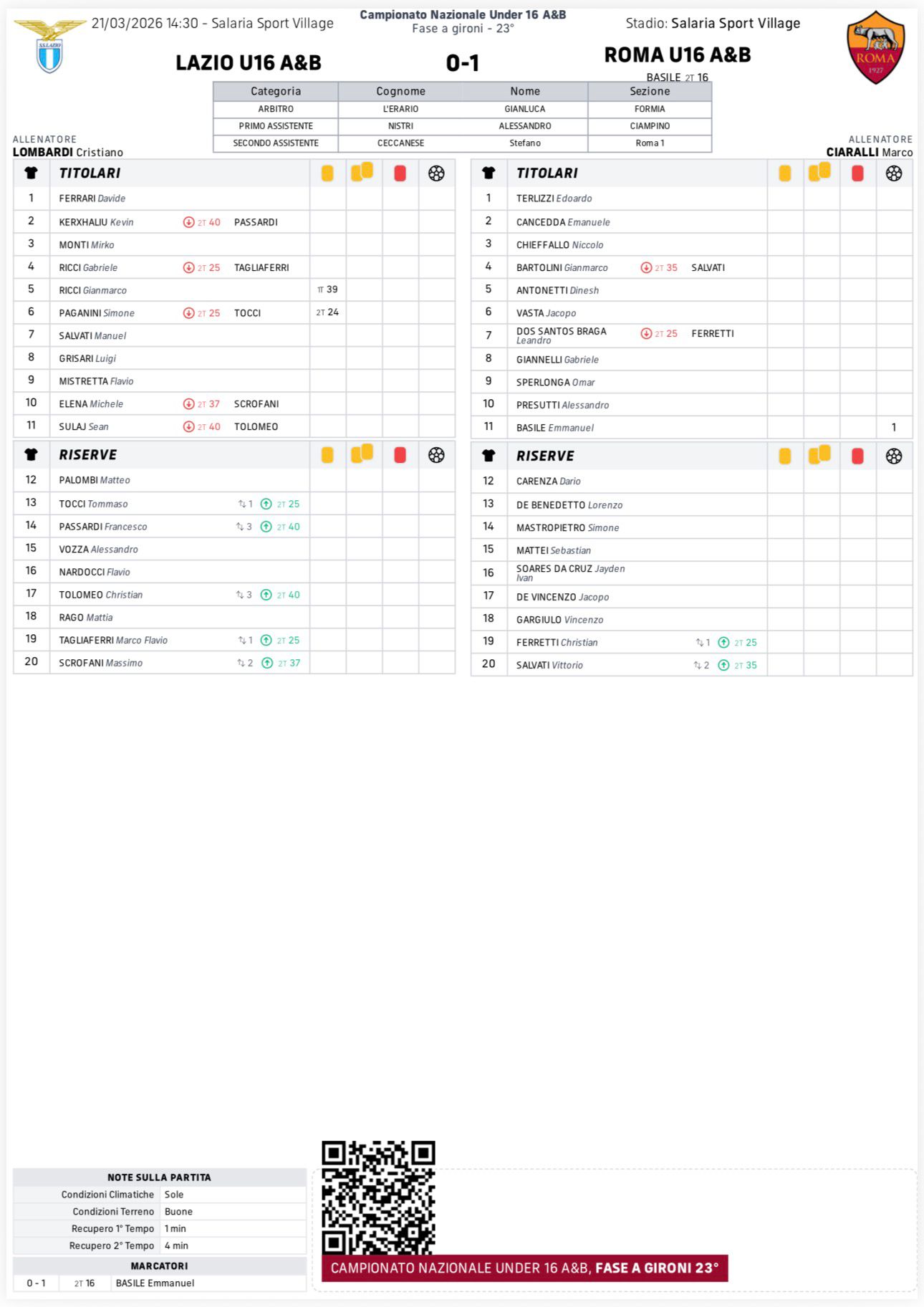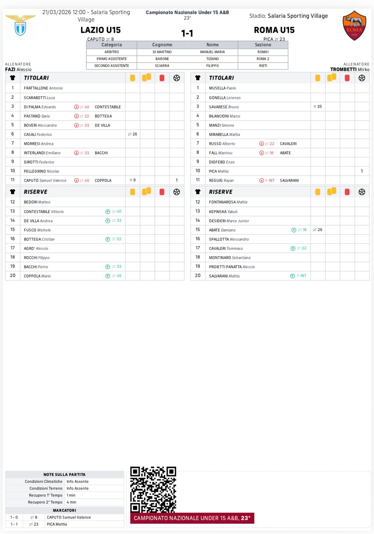 Al Salaria Sport Village nel primo derby di giornata, i classe 2011 impattano in un match molto affascinante. I ragazzi di Fazi, a conti fatti, forse avrebbero meritato qualcosa in più, vista la prestazione messa in campo, ma pagano un errore (risultato fatale) in fase di impostazione. Succede tutto nella ripresa: Caputo apre le danze su gran cross di Interlandi al 9’. I giallorossi, però, rialzano la testa, e con la palla recuperata da Diofebo, Pica realizza il pareggio. Nel finale palo incredibile colpito da Pellegrino.