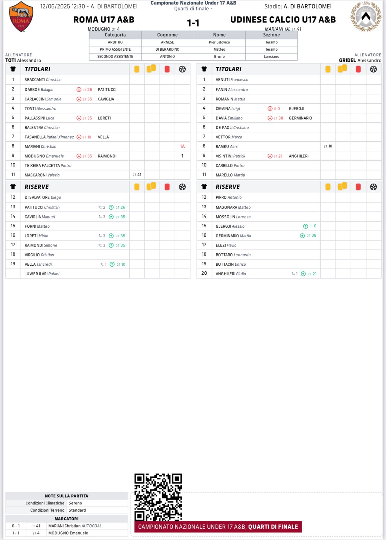 UNDER 17 Roma-Udinese 1-1: giallorossi eliminati