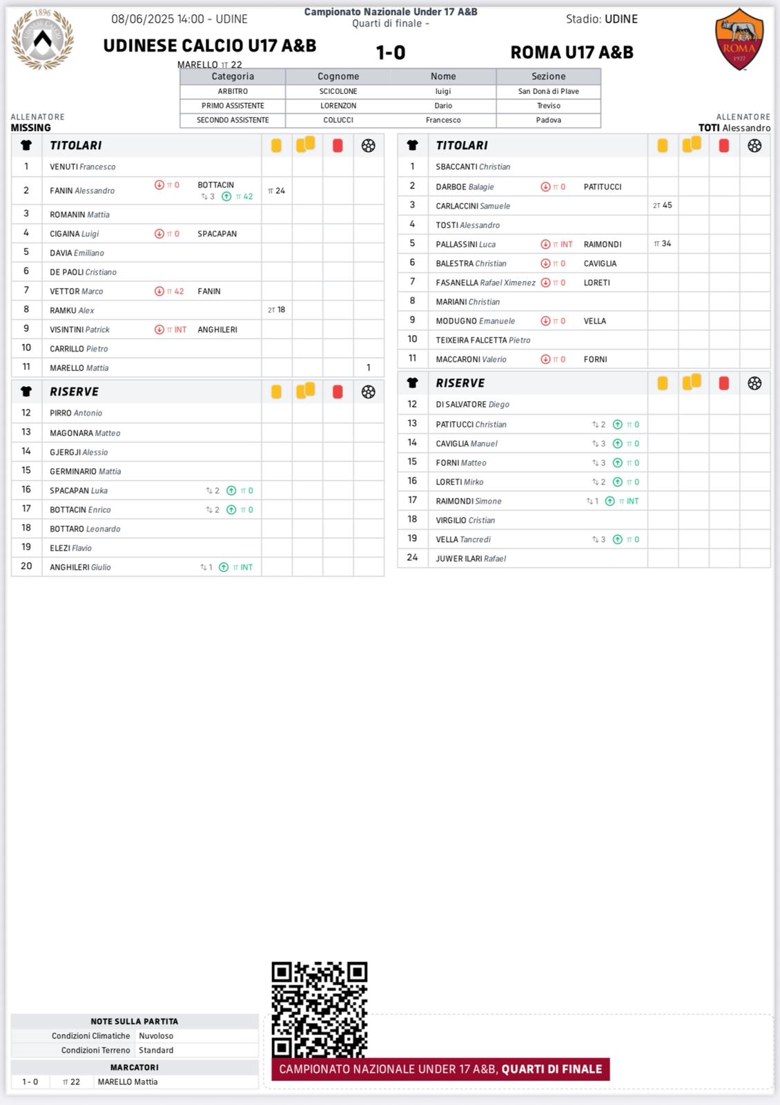 Brutta caduta per la Roma, che ad Udine perde 1-0. A segnare il gol vittoria per i bianconeri è ancora una volta Marello, che continua a mettersi in mostra in questi playoff. I giallorossi non riescono nella ripresa a rimontare e saranno così costretti a vincere nella gara di ritorno di mercoledì per evitare una disfatta. La rete friulana al 22′ del primo tempo risulta così decisiva ma il passaggio del turno è ancora nelle mani della capolista del girone C.