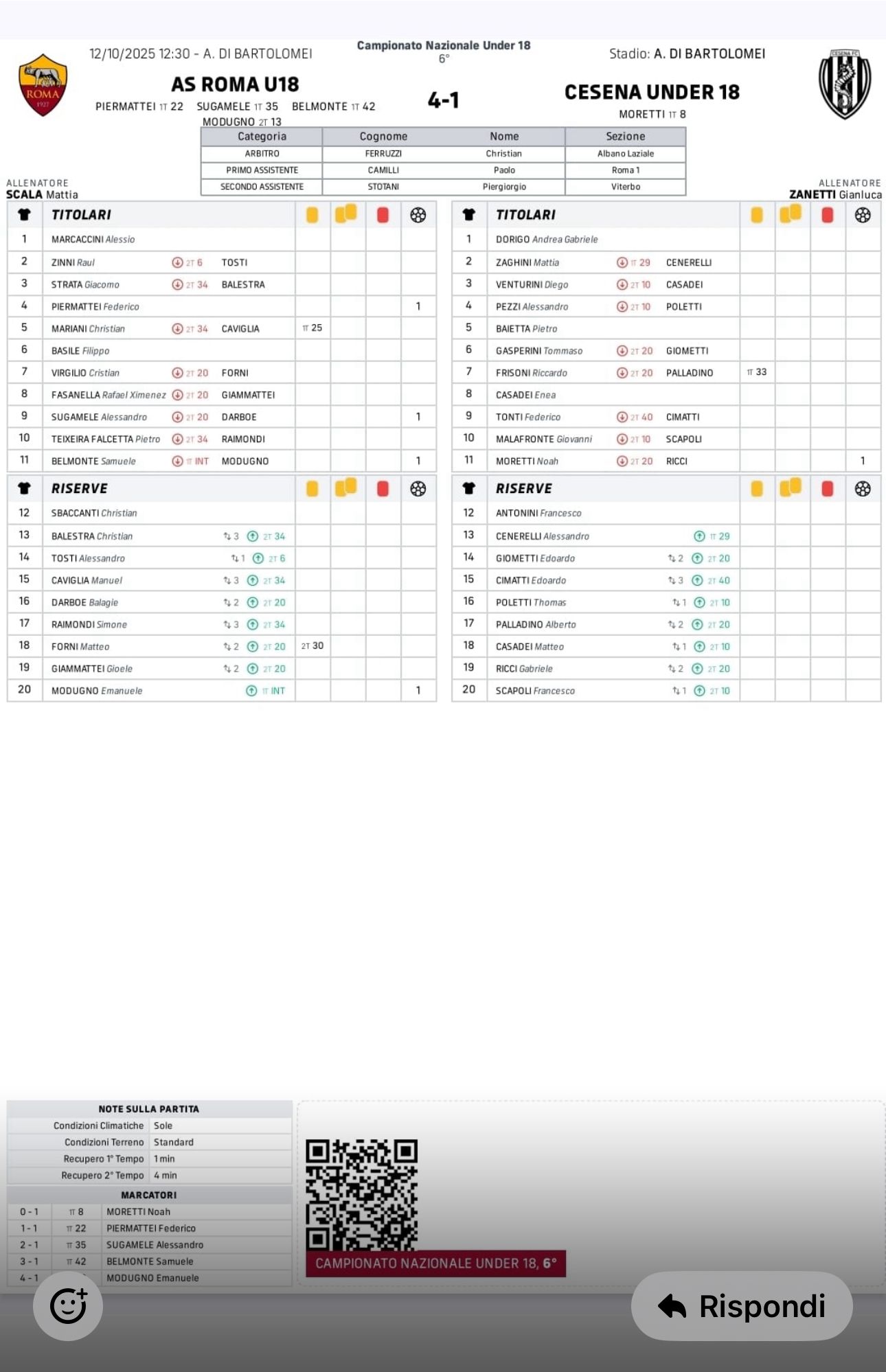 Tutto facile per la Roma di Scala. Reti di Piermattei e Modugno, oltre a quelle dei due fuori quota Belmonte e Sugamele. Nel big-match la Roma conquista il primo posto davanti al Napoli e appunto ai romagnoli che scendono al terzo posto.