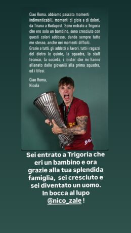 “Sei entrato a Trigoria che eri un bambino, ora grazie alla tua splendida famiglia sei cresciuto e se diventato un uomo. In bocca al lupo”.