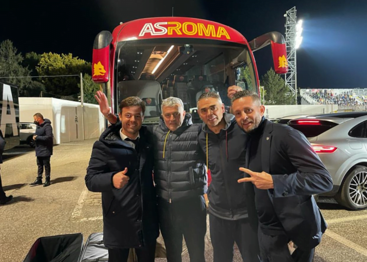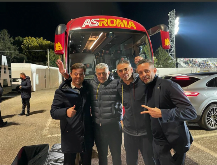 Josè Mourinho, dopo il match e la vittoria della sua squadra, ha festeggiato, prima di salire sul pullman e riprendere la stra di casa, con Nuno Santos, Tiago Pinto e Stefano Rapetti.