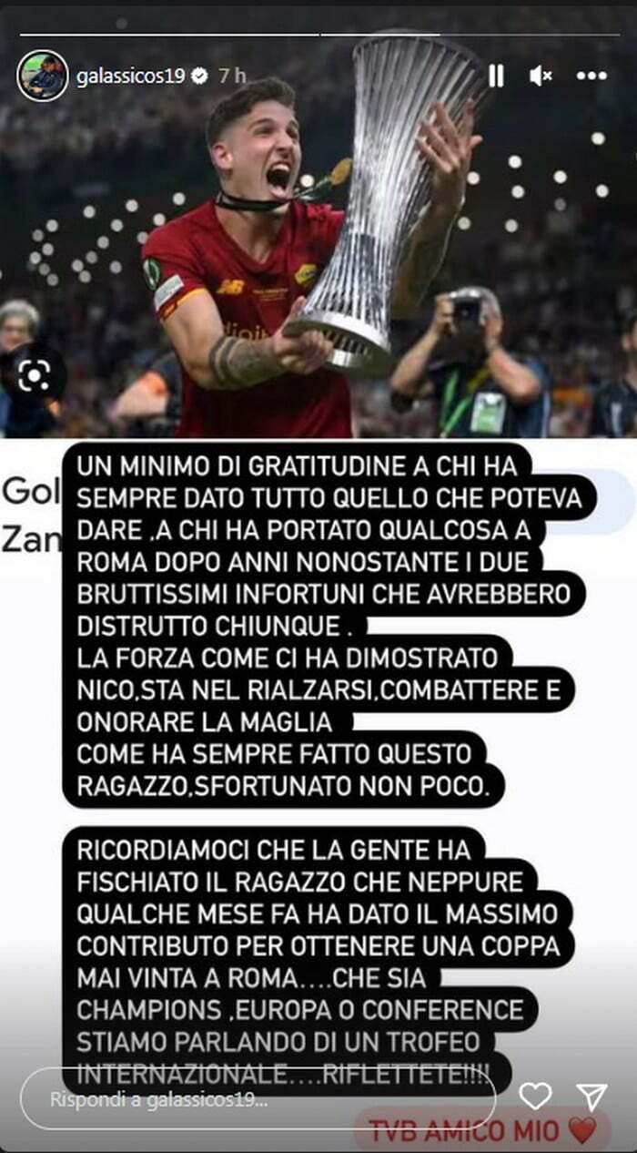 E’ uscito durante la partita contro il Genoa con un “po di fischia” che lo accompagnavano in panchina. Per il suo migliore amico, l’influencer Gaspare Galasso, lo difende senza se e senza ma pubblicando sul suo profilo social un’autentica requisitoria a difesa del numero 22: “Un minimo di gratitudine a chi ha sempre dato tutto quello che poteva dare. A chi ha portato qualcosa a Roma dopo anni nonostante i due bruttissimi infortuni che avrebbero distrutto chiunque. La forza come ci ha dimostrato Nico sta nel rialzarsi, combattere e onorare la maglia come ha sempre fatto questo ragazzo, sfortunato non poco. Ricordiamoci che la gente ha fischiato il ragazzo che neppure qualche mese fa ha dato il massimo contributo per ottenere una coppa mai vinta a Roma. Che sia Champions, Europa o Conference stiamo parlando di un trofeo internazionale. Riflettete… Ti voglio bene amico mio”.