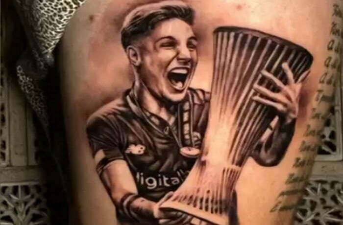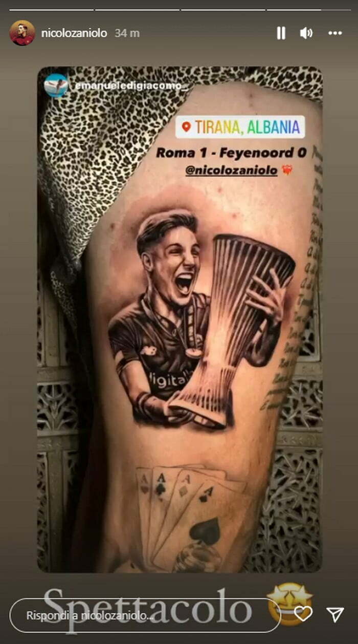 I tifosi romanisti sono passionali, tutti lo riconoscono, ma tuarsi Zaniolo con la Coppa Comference non è da tutti. Un tifoso, appunto, si è fatto tatuare l’immagine di Zaniolo felice con la Conference in mano con in sottofondo la canzone che ornai è un inno alla vittoria, “Never going home”, tradotto, “La Roma si, il Feye no”, la canzone che accompagna i gol della squadra.