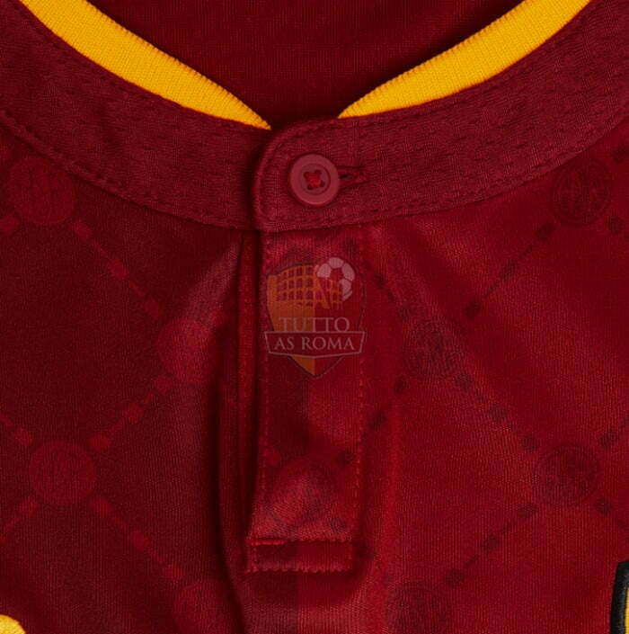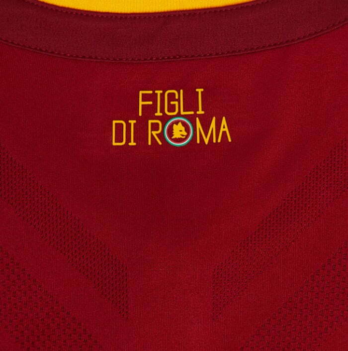 La scritta “Figli di Roma” è posta sul retro del collo in omaggio al legame tra la città, la squadra che ne porta il nome e coloro che indossano la maglia. I pantaloncini e i calzini completano il look nel tradizionale rosso, mentre la divisa del portiere si presenta in un vibrante verde arricchito da un motivo grafico tono su tono.