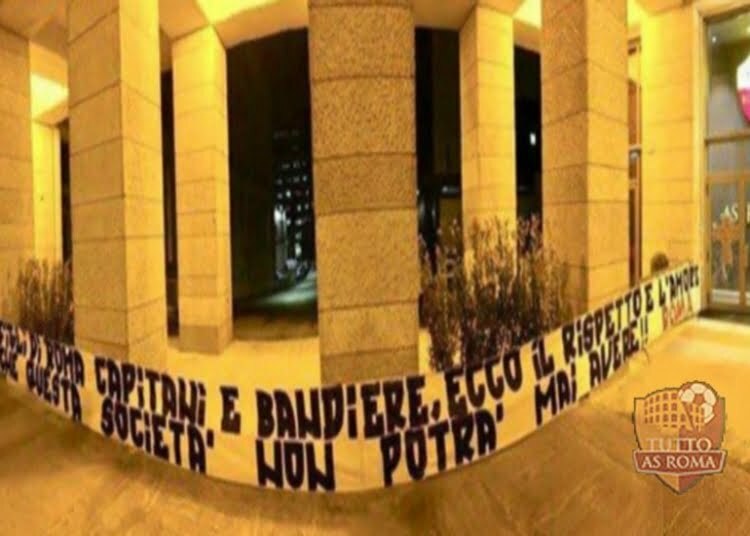 Nella nuova sede all’EUR, in queste ore è stato esposto uno striscione contro la società giallorossa dopo il “ben servito” a Daniele De Rossi, bandiera e Capitano della Roma; “Figli di Roma, capitani e bandiere. Ecco il rispetto e l’amore che questa società non potrà mai avere”, si leggeva. Altri striscioni sono stati esposti in varie zone della cittò, zone mirate dal “Gruppo Roma” come simboli della protesta romanista; uno, ancora contro la società, a Testaccio dove si leggeva “Un presidente maiale e una società incompetente. DDR per sempre nel cuore della tua gente”, chiaro il messaggio rivolto al Presidente James Pallotta. L’altro sotto casa di Capitan De Rossi dove annunciava l’amore per lo stesso e l’orgoglio di averlo visto con la maglia giallorossa calcare tutti i campi del mondo: “DDR nostro vanto” si leggeva nei pressi di Castel Sant’Angelo.