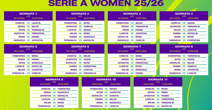 DERBY E BIG MATCH Il derby di Roma è in programma alla sesta giornata (16 novembre, andata in casa delle giallorosse), quello di Milano alla nona (14 dicembre, andata in casa rossonera); Roma-Juventus, rivincita dell’ultima finale di Coppa Italia e ‘antipasto’ della Supercoppa del 10-11 gennaio, il 7 dicembre. Inter-Juventus, sfida tra le prime due classificate dello scorso campionato, inaugurerà invece il 2026 (18 gennaio). Il primo derby regionale della stagione sarà infine quello emiliano tra Parma e Sassuolo, alla seconda giornata (12 ottobre).
