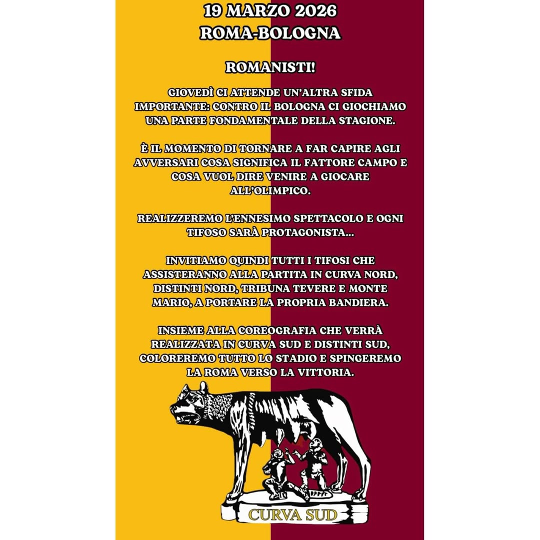 In occasione della partita contro il Bologna, la Curva Sud invita tutta la tifoseria di tutto lo stadio, a portare con se la bandiera giallorossa. Il Comunicato