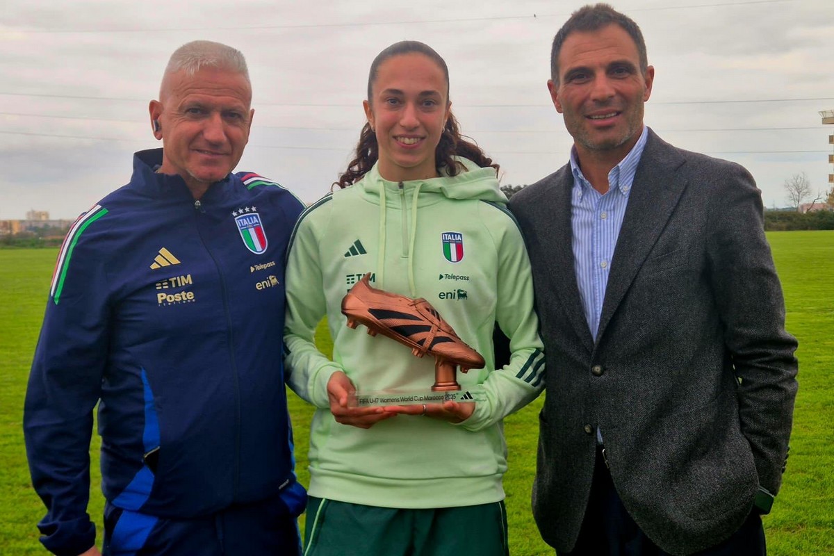 Uno straordinario riconoscimento, per un Mondiale che ne ha esaltato il grande talento e le qualità. Giulia Galli, attaccante classe 2008 della Roma e della Nazionale, è stata premiata oggi con lo scarpino di bronzo FIFA per il terzo posto nella classifica marcatrici del Mondiale Under 17 che si è giocato nell’ottobre scorso in Marocco: per Galli, già protagonista nelle Isole Faroe durante l’Europeo di maggio, cinque gol e un assist. Prima la doppietta alla Costa Rica, poi quella alle padrone di casa del Marocco, infine una rete nel 4-3 al Brasile, in un Mondiale che per l’Italia si è concluso con la sfortunata eliminazione ai rigori nei quarti contro il Messico.