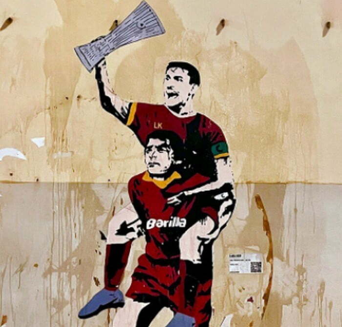 In onore della vittoria in Conference League, l'”artista di strada”, Laika, ha impressionato, in un murale, il vecchio Capitano, Agostino Di Bartolomei, che porta in braccio, quello nuovo, Lorenzo Pellegrini. Lo stesso murale si trova nel quartiere Testaccio. L’artista, oltre al disegno, ha voluto esprimere il suo pensiero: ” E’ dal 30 maggio 1984 che aspettavamo questo momento, da quando non riuscimmo ad alzare la Coppa dei Campioni sul prato dell’Olimpico. Una coppa europea sognata per decenni che ora il capitano Lorenzo Pellegrini ha sollevato al cielo nello stadio di Tirana. Un’immagine che per noi tifosi custodisce in sé i sogni e le speranze che ci hanno accompagnato in tutti questi anni. Questa coppa è di tutti noi, di tutti i giallorossi che non ci sono più, di tutti i calciatori che hanno vestito questa maglia con orgoglio e lealtà, di tutti i nostri capitani romani e romanisti, da Giuseppe Giannini a Francesco Totti fino a Daniele De Rossi. Ma soprattutto è di Agostino Di Bartolomei, simbolo eterno di purezza e romanismo. Ago, “siamo entrati in porto col vessillo!”
