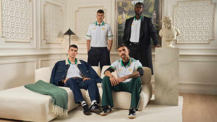 Il colletto e le iconiche tre strisce adidas sulle spalle in verde, il logo adidas Originals e il trigramma tradizionale “ASR” in un vivace color giallo a contrasto su fondo bianco, creano un impatto visivo forte e distintivo caratterizzato anche da un pattern che richiama le geometrie tipiche dei giardini