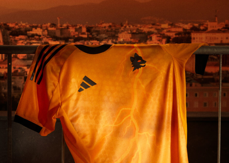 Il nuovo kit Away per la stagione 2025/26 incarna la potenza e la maestosità dell’Antica Roma attingendo dal mito che avvolge la storia ultramillenaria dell’Urbe. Il pattern su fondo arancione riporta infatti un possente fulmine, simbolo associato a Marte come dio dei duelli e del tuono e padre, per la leggenda, di Romolo e Remo.