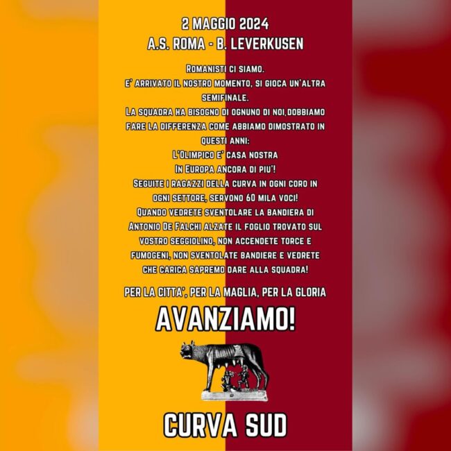 Questa sera l’Olimpico sarà stracolmo per la partita che la Roma affronterà contro il Bayer Leverkusen per l’andata della semIfinale dell’Europa League. E la Curva Sud non si fa trovare impreparata… è pronta la scenografia per lo stesso match che partirà con lo sventolio della bandiera di Antonio De Falchi. Ma ci sono delle istruzioni da seguire perchè tutto avvenga perfettamente. L’avvocato Lorenzo Contucci ne fa seguito su un suo post che indirizza i tifosi a seguirle: