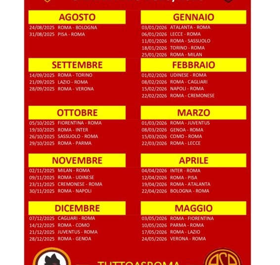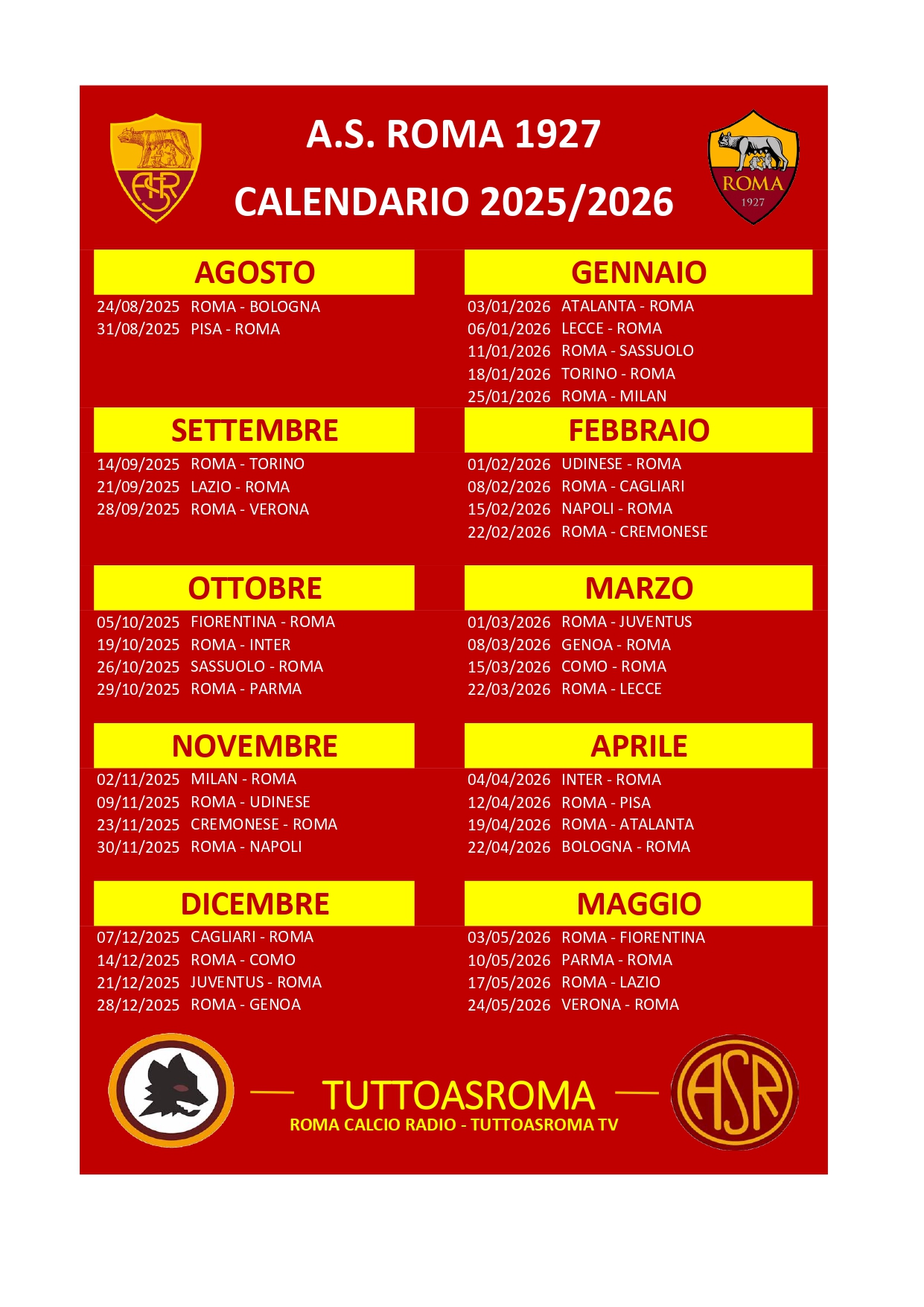 Dopo il sorteggio del prossimo campionato della Serie A 2025/2026, la redazione di Tuttoasroma ha messo on line lo stesso in formato PDF per conservarlo e per utilizzarlo per le vostre esigenze. affianco di ogni partita potete scrivere il risultato. Sperando di avervi fatto cosa gradita… FORZA ROMA!