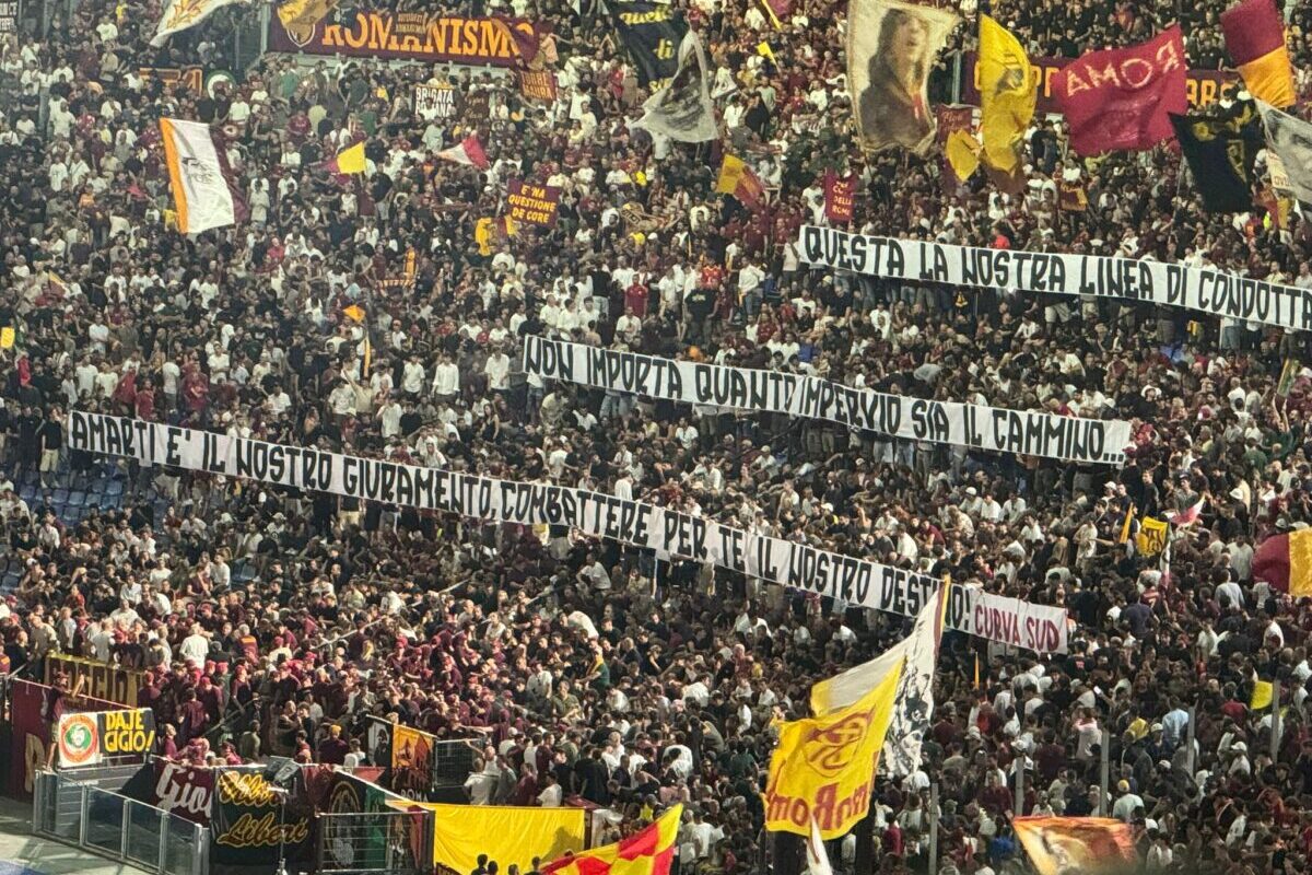 Rinnovati e comuni intenti anche per la Curva Sud, con vecchi, semplici e essenziali ideali romanisti: «Questa la nostra linea di condotta: non importa quanto impervio sia il cammino, amarti è il nostro giuramento, combattere per te il nostro destino», recita lo striscione, firmato Curva Sud, che campeggia al centro del settore poco prima del fischio d’inizio. La Roma prima di tutto, è il messaggio, tutto ciò che non è Roma, Romanismo, deve restare fuori dalla curva e dallo stadio.