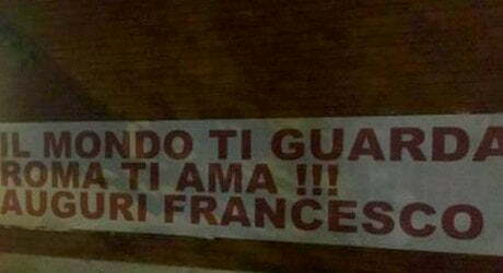Auguri in tutte le salse, pure su una gru. Ai tifosi romaniste la fantasia non manca di certo e per mostrare lo striscione di buon compleanno a Totti aldilà delle mura di Trigoria si sono serviti di un braccio meccanico: “250! Auguri Capitano“, il messaggio per il 40° con il chiaro riferimento al record di gol. Sempre fuori dal Bernardini ieri mattina è stato esposto un altro cartello, appeso in maniera “classica” sul cancello di fronte all’entrata: “Un uomo, un simbolo, un amore, un eroe. In due parole: Francesco Totti! Auguri“. E nel luogo simbolo di Roma, il Colosseo, non poteva mancare uno striscione: “L’amore vince su tutto e noi crediamo all’amore. Roma si inginocchia al suo imperatore… Tanti auguri Capitano“. Nella strada da cui è nato il 10 giallorosso, via Vetulonia, a Porta Metronia, un’altra dedica per quel Pupone cresciuto dando calci al pallone: “Il mondo ti guarda… Roma ti ama!!! Auguri Francesco“.