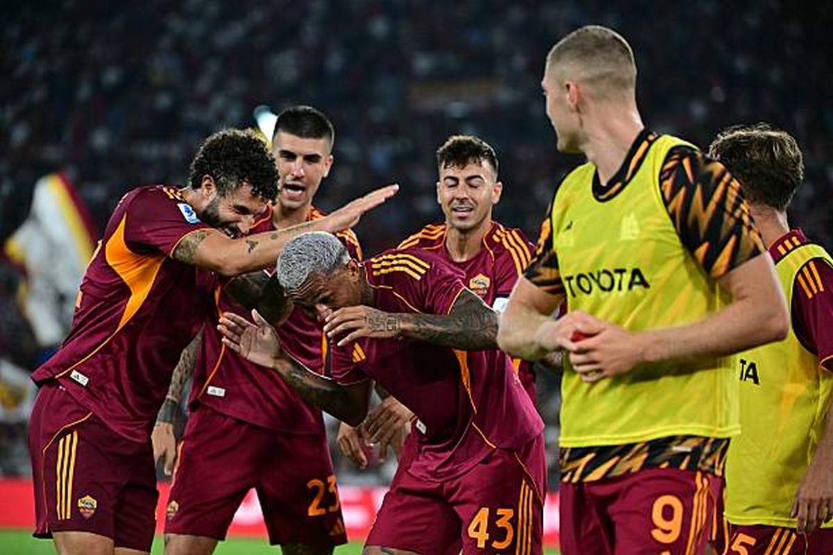 Wesley Esulta gol con compagni Roma-Bologna 23082025