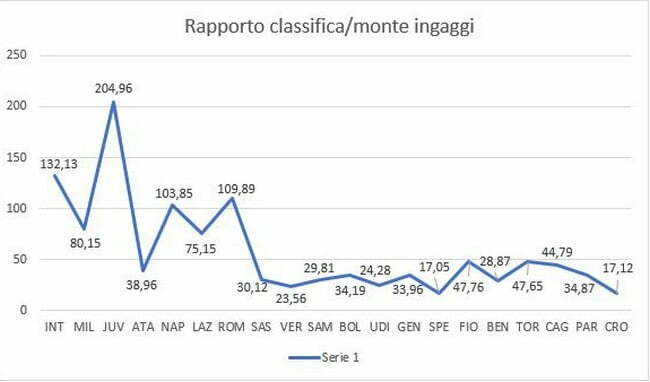 Ad un primo sguardo appare evidente la spaccatura tra i club che occupano le prime sette posizioni della classifica e il resto delle squadre del campionato, con alcune importanti eccezioni. Tra queste, meritano particolare attenzione l’Atalanta – che con un monte ingaggi ridotto si trova al quarto posto in Serie A – e la Juventus, nettamente superiore alle avversarie, ma in terza posizione.