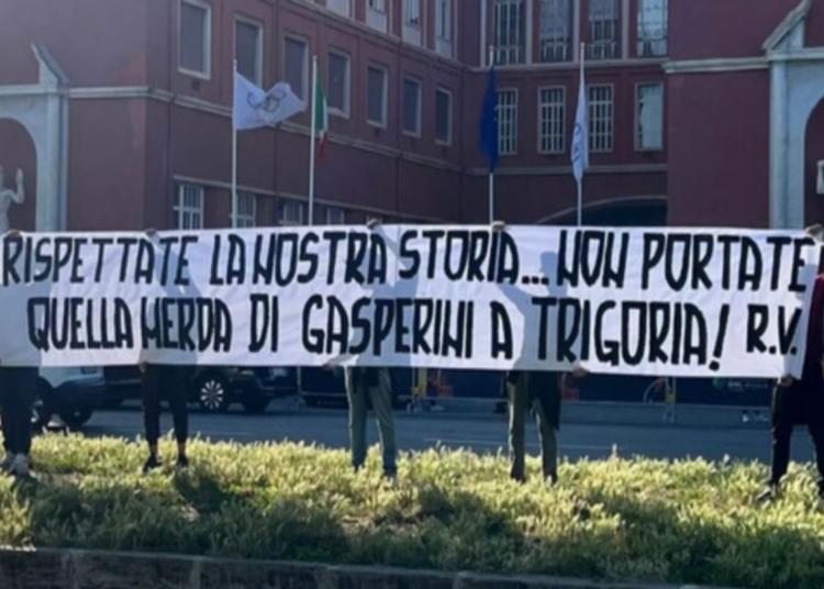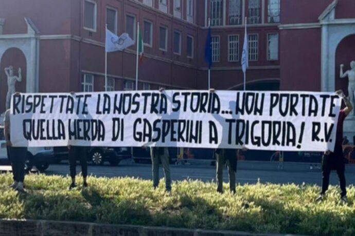 “Rispettate la nostra storia… non portate quella m***a di Gasperini a Trigoria!”, recita lo striscione esposto prima della partita fuori lo stadio. Giampiero Gasperini è uno dei papabili per la panchina giallorossa.