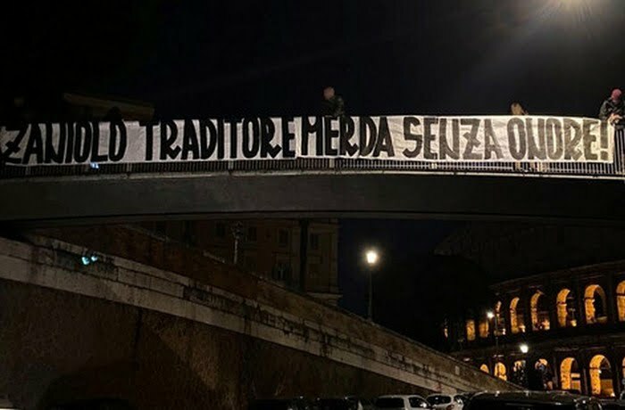 Ieri si limitavano a prenderlo a “schiaffi e sberleffi” sui social, ma da stanotte le cose sono cambiate. Poteva diventare Re a Roma ma forse l'”inesperienza caratteriale” del numero 22 lo ha portato a emarginarsi da solo, anche Mourinho, ieri in conferenza, praticamente lo ha scaricato. Lo ha cercato il Milan, il Tottenham e ha rifiutato il Bournemouth, suscitando l’ira della proprietà e ha bloccato il mercato della Roma. Ha fattoi tutto e di più, e ora si trova circondato… è solo. La protesta si è riversata, come detto, dai social al ponte davanti al Colosseo, su una scritta su uno striscione… “Zaniolo traditore, m***a senza onore!”. Tempi bui per il “mancato talento” che poteva esprimere. Poteva diventare Re a Roma…